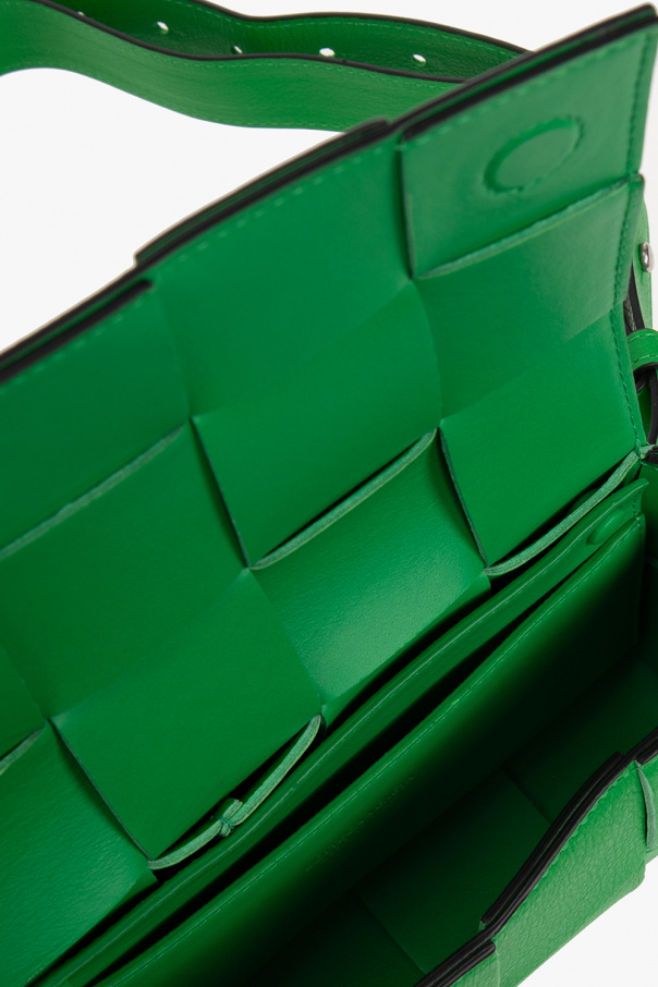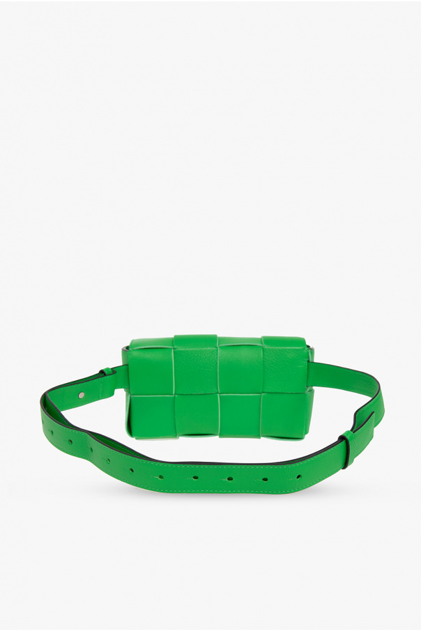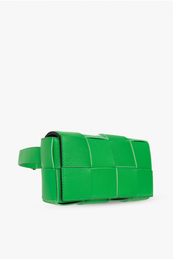 Green ‘Cassette Mini’ belt bag from Bottega Veneta. Crafted from buffalo leather accentuated with the brand's signature Intreccio weave, this design secures with magnetic snaps and features an adjustable strap, silver-tone metal hardware and one internal compartment with a slip pocket.