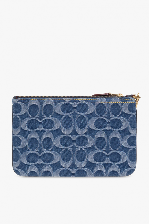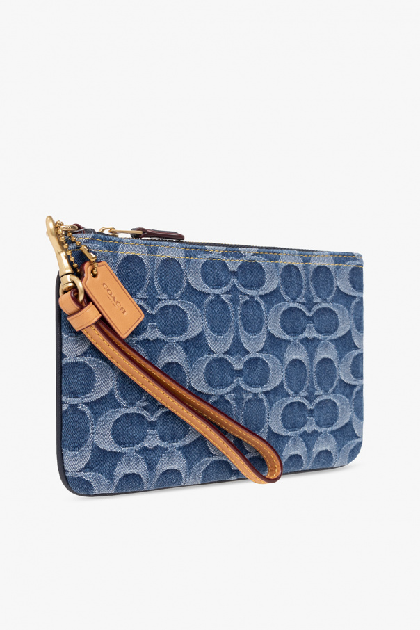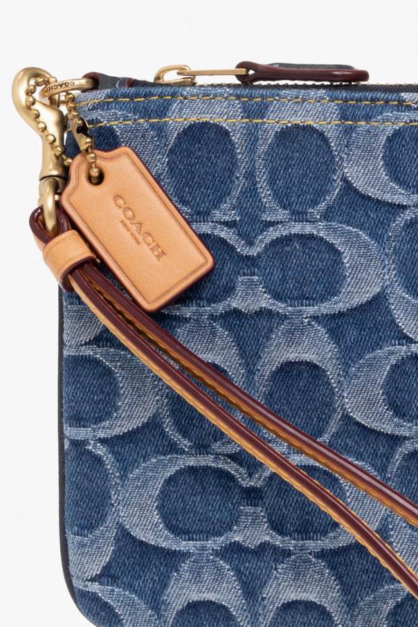 Navy and blue ‘Wristlet Small’ handbag from Coach. Cut from denim with a monogram and leather trims, this model features a zip fastening, detachable wrist strap in beige, gold-tone metal hardware and one internal compartment with two card slots.
