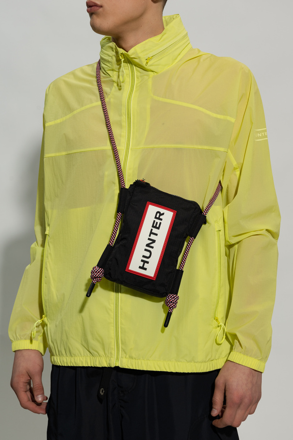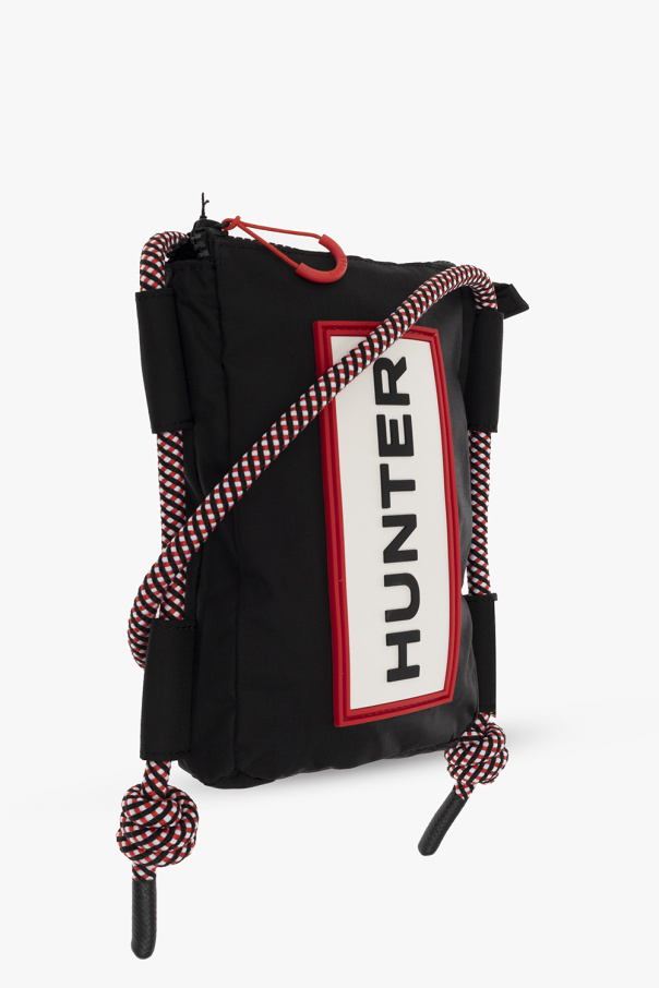 Black shoulder bag from Hunter. Made of recycled materials, this model features a zip fastening, rubber logo detail in white and red, adjustable shoulder strap in red, white and black, one internal compartment and black metal hardware.