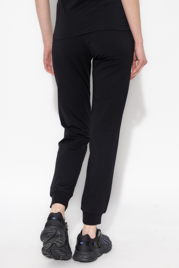 Black sweatpants from EA7 Emporio Armani. Made of an organic cotton blend, this pair features an elastic drawstring waistband, printed logo pattern in gold-tone, two slip pockets and ribbed cuffs.