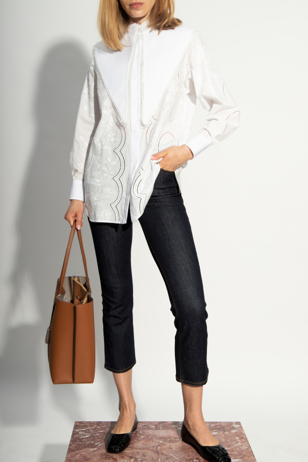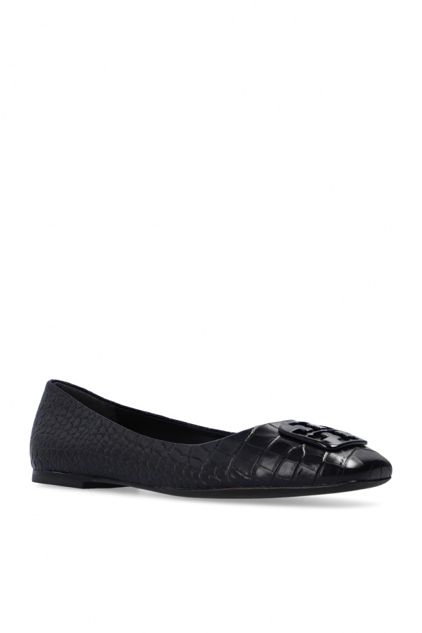 Black ‘Georgia’ ballet flats from Tory Burch. Crafted from leather with a crocodile skin effect, this pair features a logo appliqué and a black leather sole.