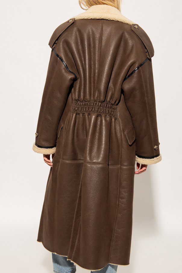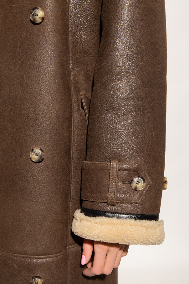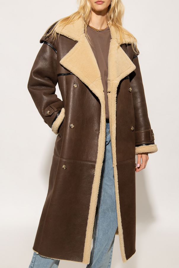 Brown ‘Jordan’ long coat from The Mannei. Crafted from sheep leather with an oversize, double-breasted silhouette, this style features button fastenings, an elastic trim at the back, shoulder epaulettes, cream shearling trims on the collar and cuffs, two flapped pockets and a single back vent.