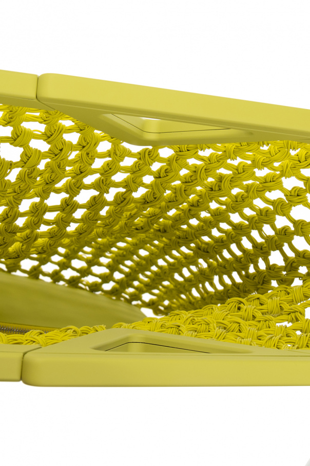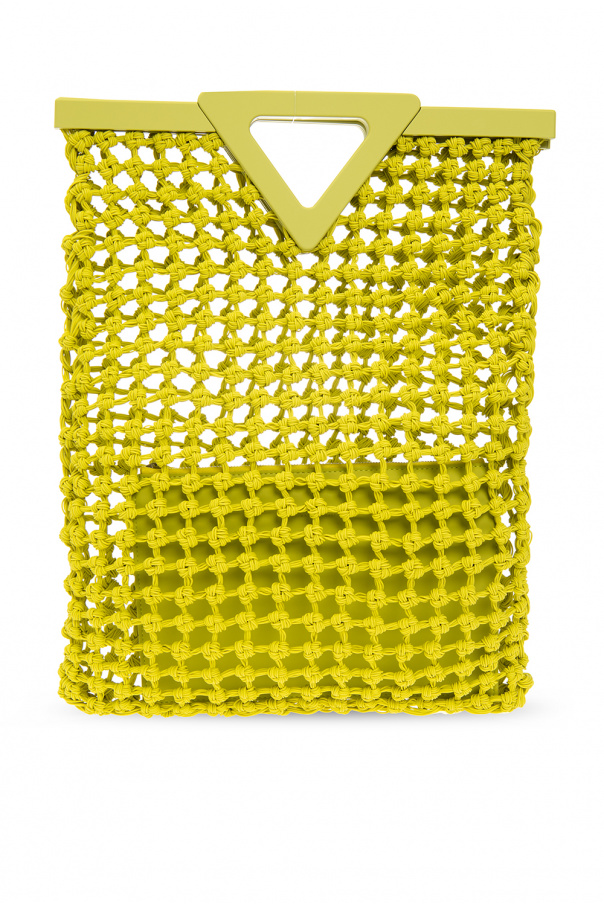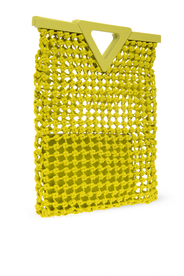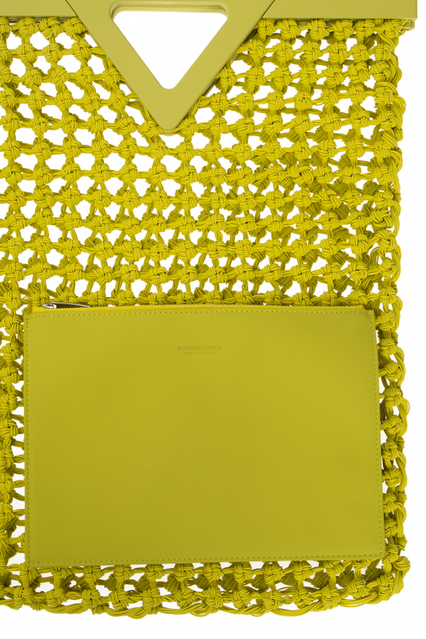 Light green ‘Point Medium’ handbag from Bottega Veneta. Made of decorative woven rubber, this design features the label’s signature triangular handle and logo-embossed zipped pouch.