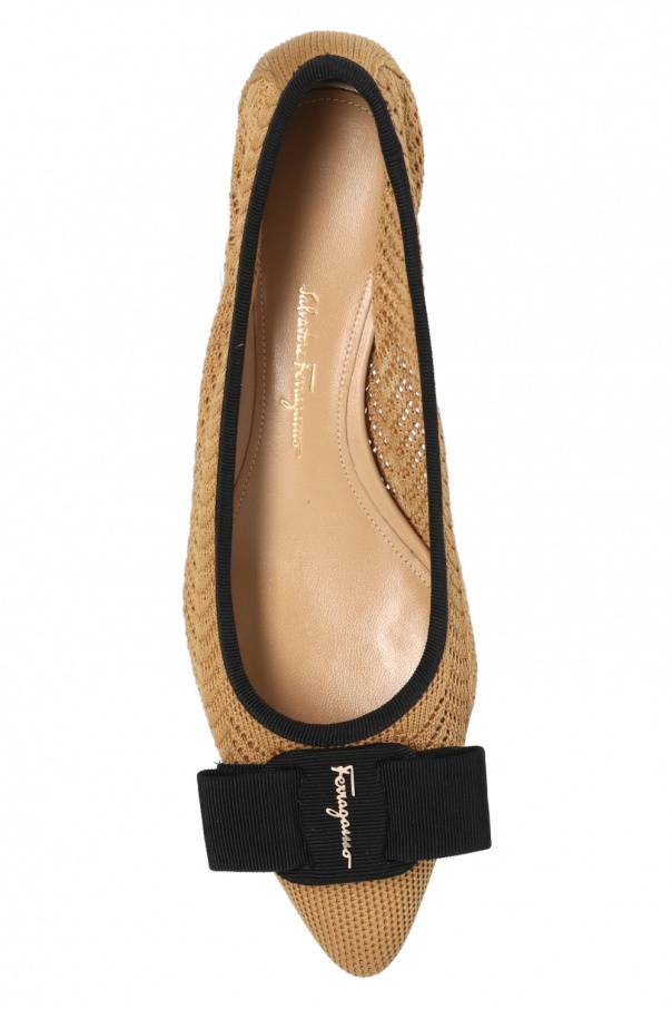 Brown and black ‘Viva Knit’ ballet flats from Salvatore Ferragamo. Set on a black leather sole, this pair is enriched by perforations and a bow with logo detail.