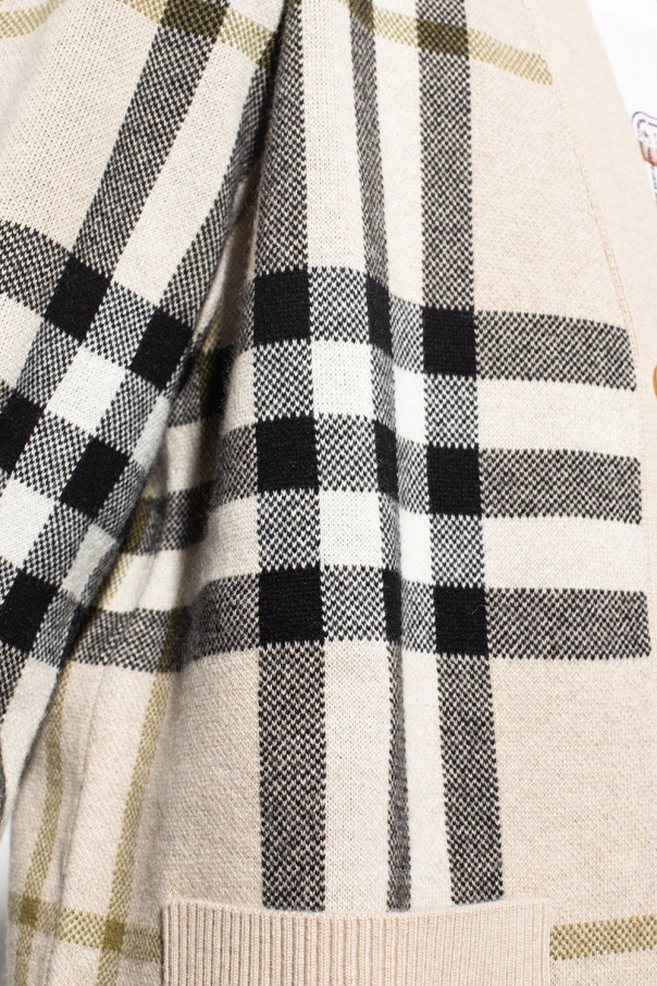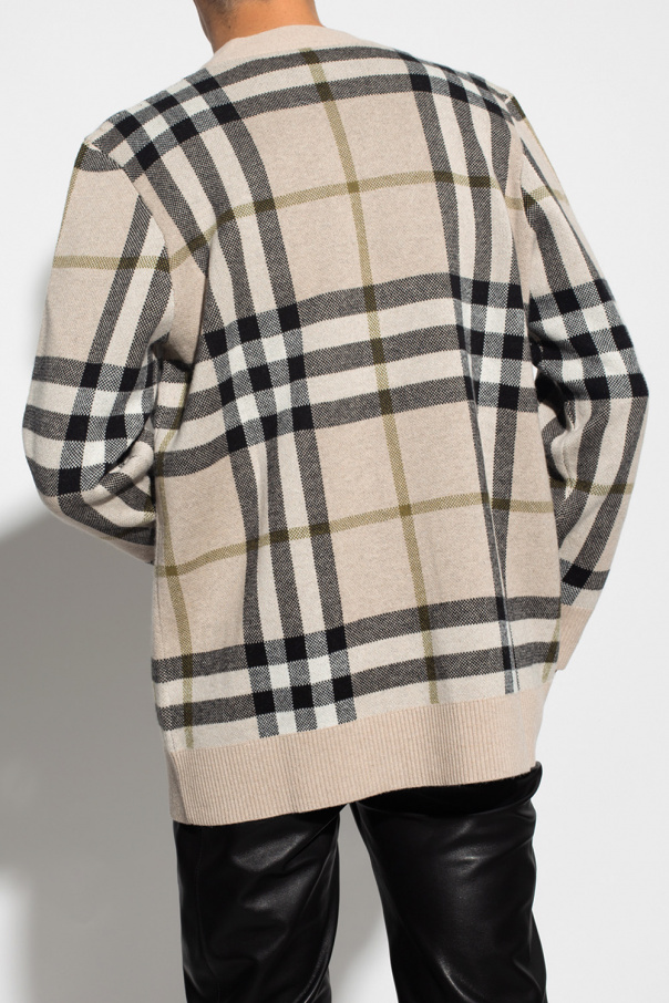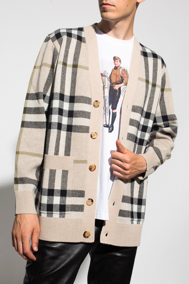 Beige cardigan from Burberry. Crafted from a wool and cashmere blend with an all-over check pattern, this style features button fastenings, two patch pockets and ribbed trims on the edges.