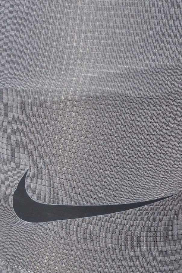 Grey short training leggings from Nike. Made of ‘Nike Breathe’ fabric with sweat-wicking ‘Dri-FIT’ technology. Black elasticated waistband featuring a grey logo. Black logo print on the front.