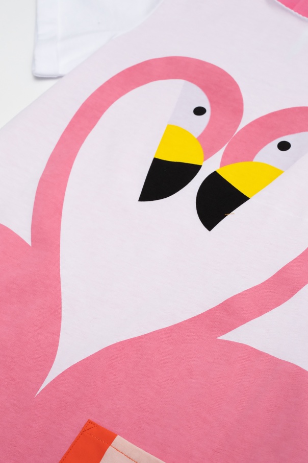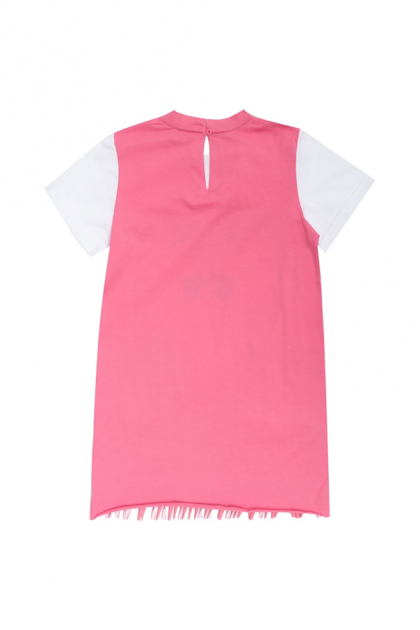 White and pink dress from Stella McCartney Kids. Illustrated with a pink, black and yellow animal print, this cotton-crafted item features a back button fastening, two patch pockets and a fringed hemline.