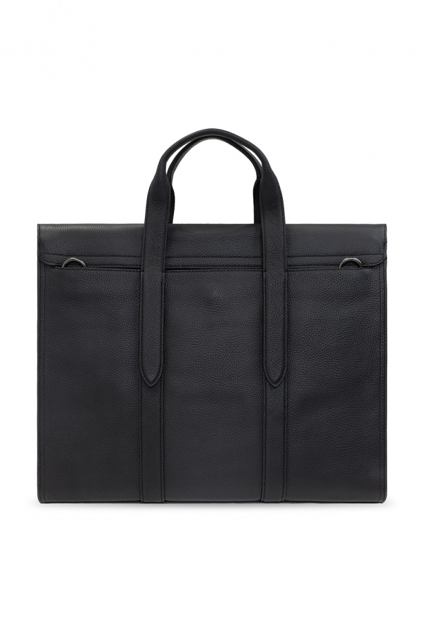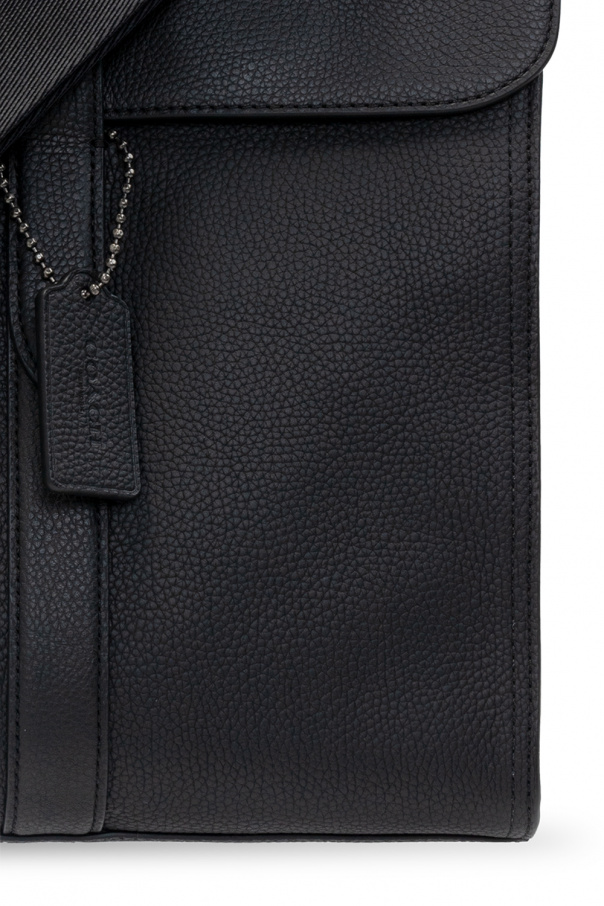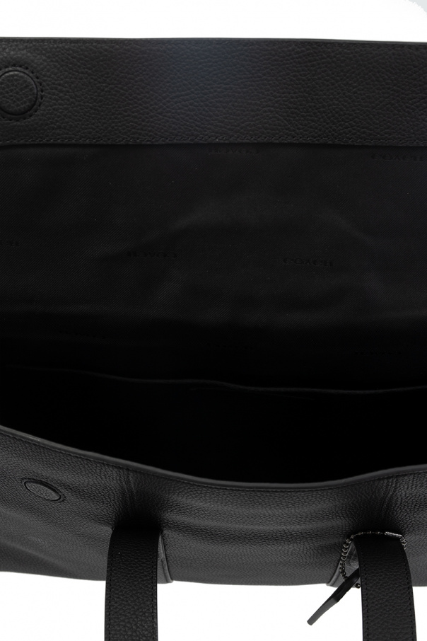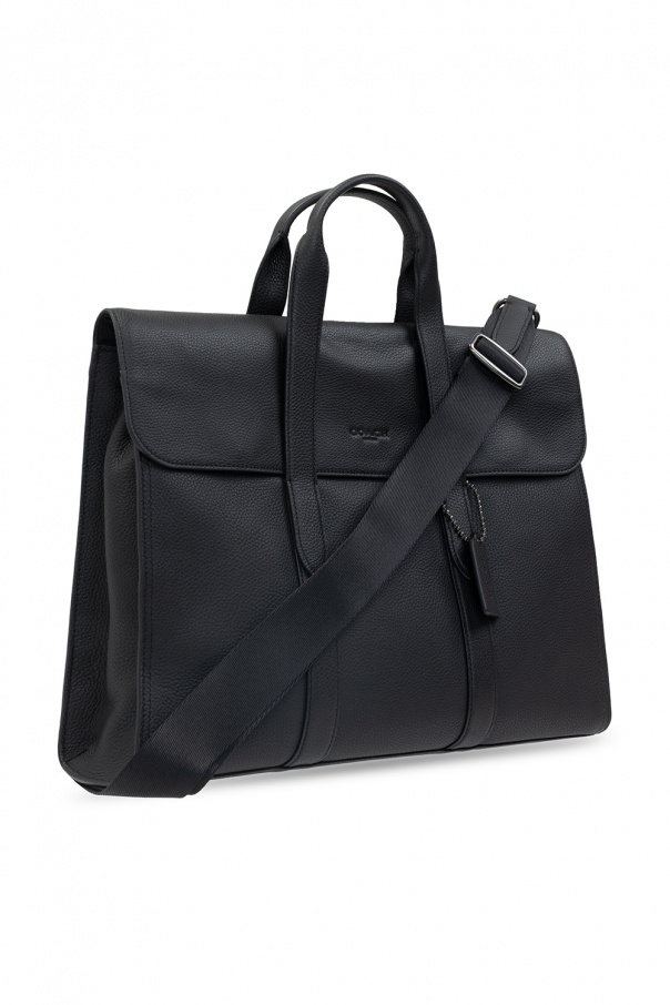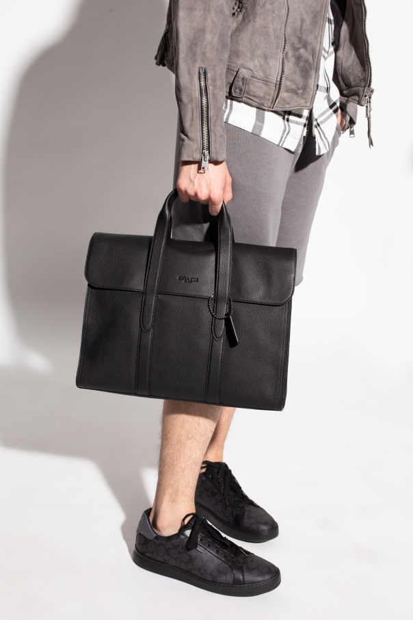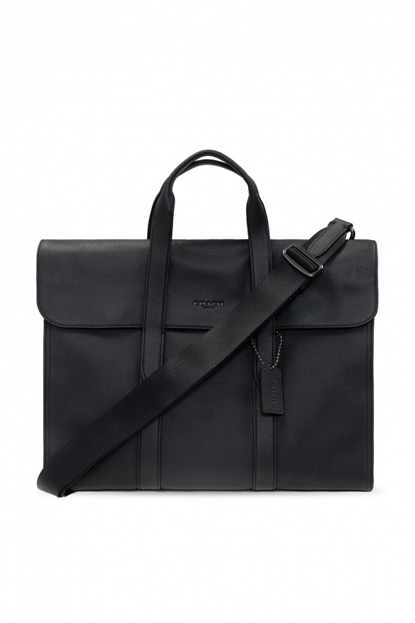 Black ‘Metropolitan Portfolio’ laptop bag from Coach. Emblazoned with an embossed logo pattern, this design secures with a magnetic fastener and features two half-round handles, a slip pocket at the back, a shoulder strap and one internal compartment with three slip pockets.