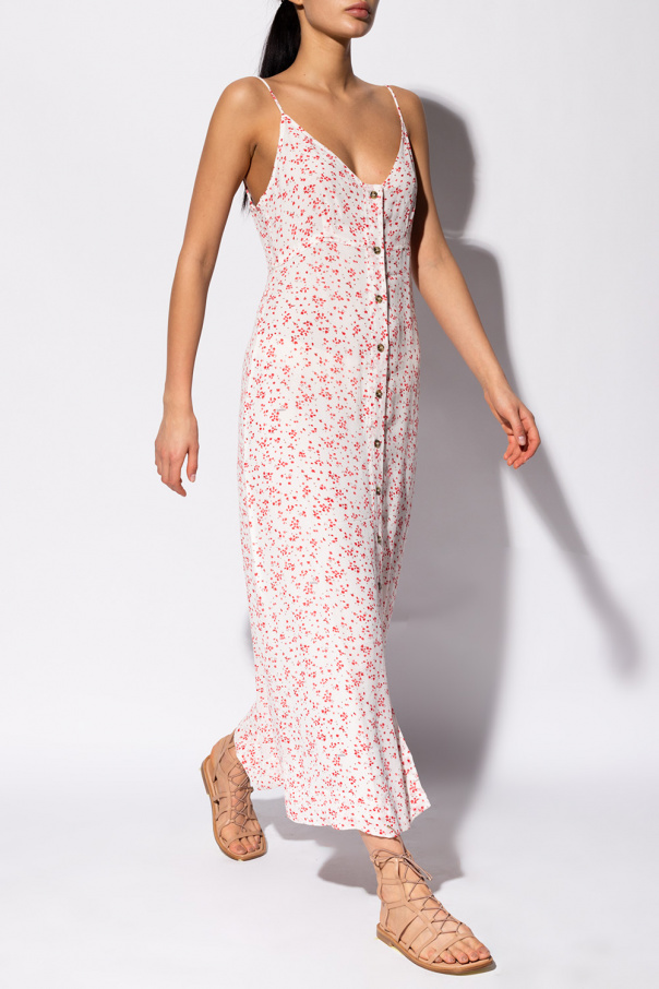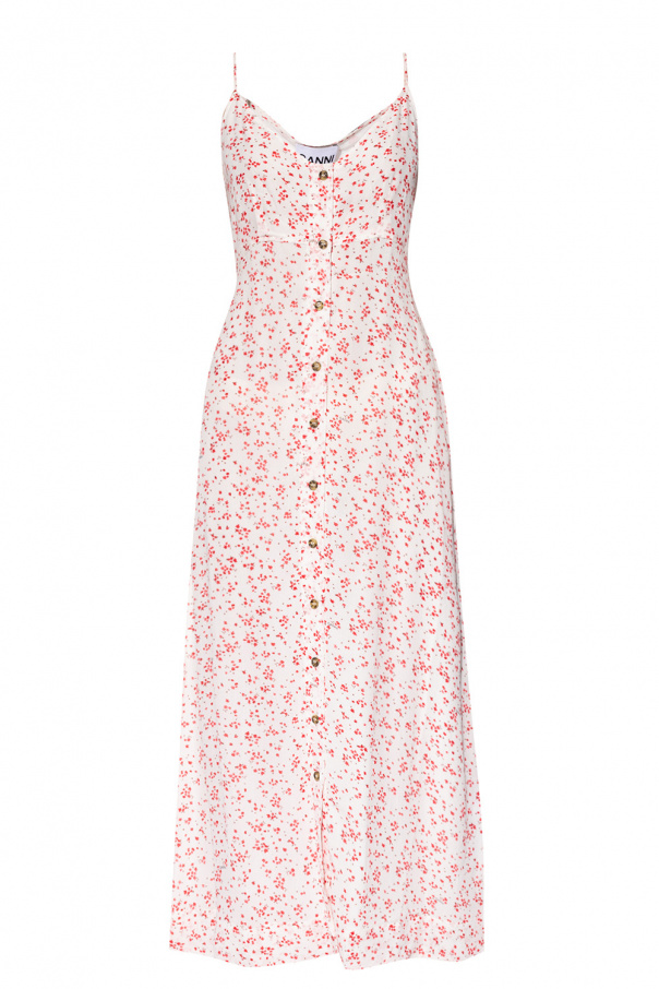 White slip dress from Ganni. Illustrated with a red and maroon floral print, this style features button fastenings a slit on the bottom hem.