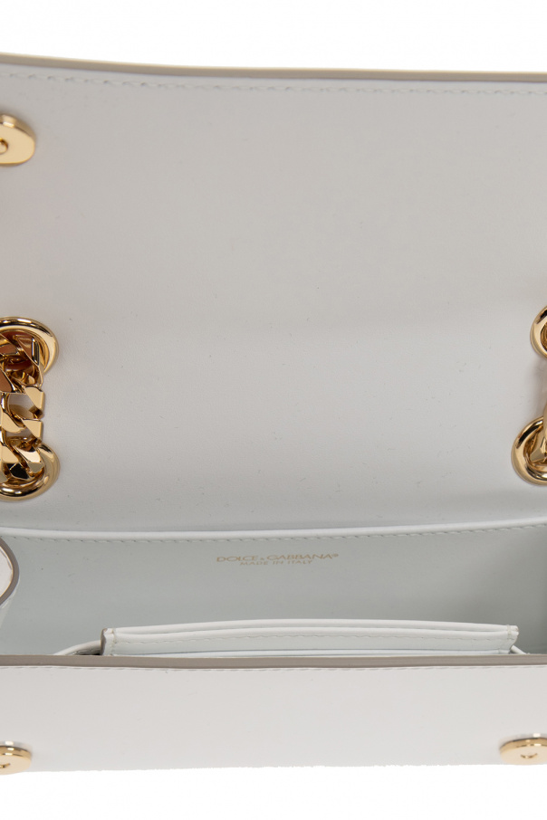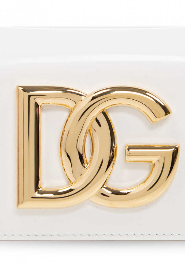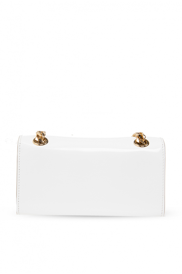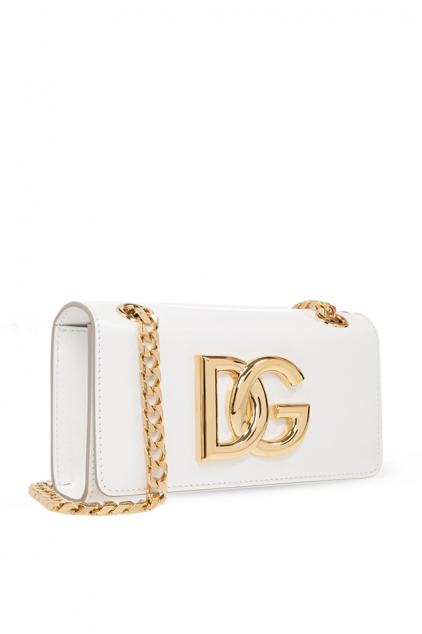 White ‘3.5’ phone pouch from Dolce & Gabbana. Made of patent calf leather, this model features magnetic snaps, gold-tone DG logo appliqué, shoulder chain, gold-tone metal hardware and one internal compartment with two slip pockets. Comes with a case with three card slots.