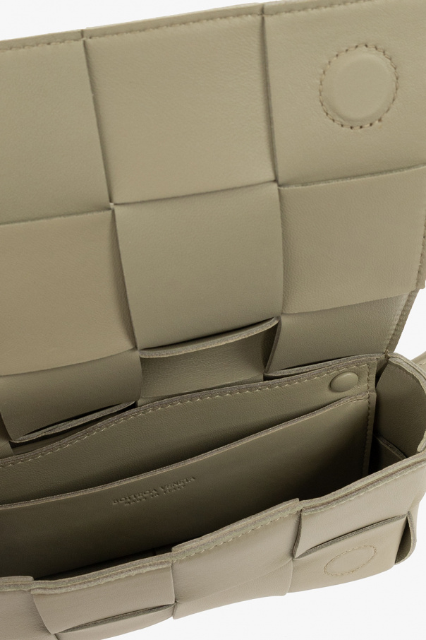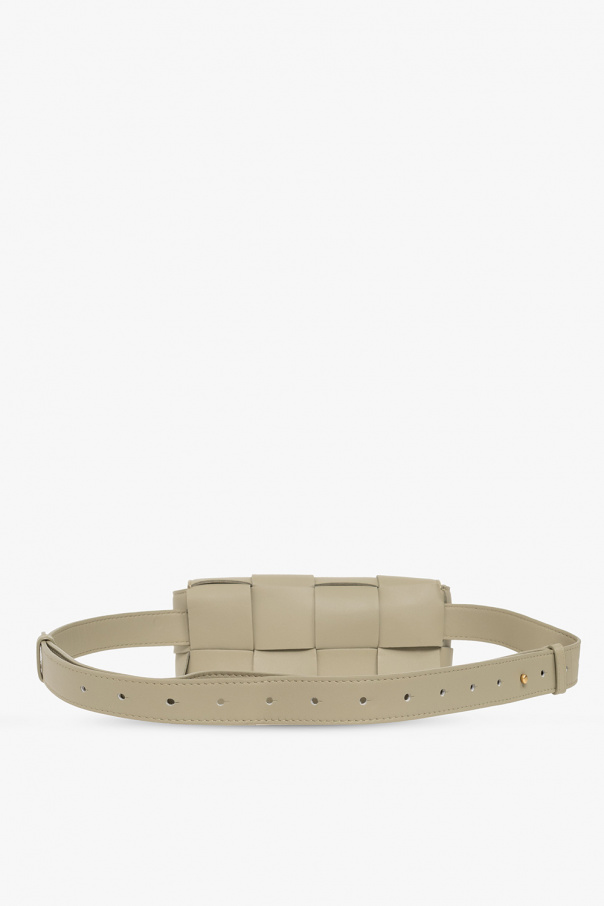 Greenish grey ‘Cassette Mini’ belt bag from Bottega Veneta. Made from lamb leather with the brand's signature Intreccio weave, this design secures with magnetic snaps and features an adjustable strap, gold-tone metal hardware and one slip pocket inside.