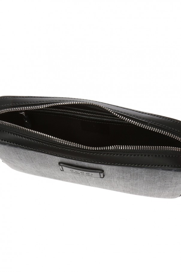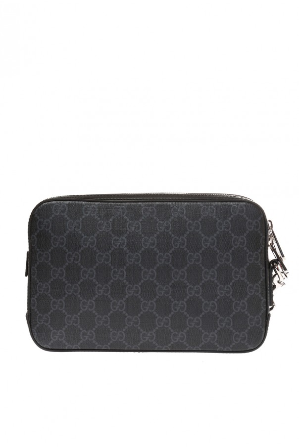 Black clutch from Gucci. Made of 'GG Supreme' canvas. Fastened with two-way zip. Enriched by printed grey logo pattern. Interior has 1 compartment and 1 zip pocket. Included wrist strap, featuring signature navy-red-navy 'Web' motif.