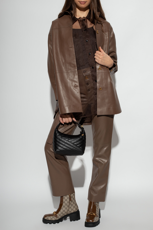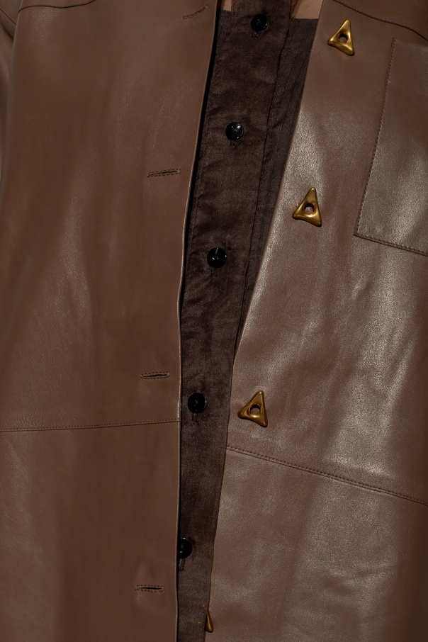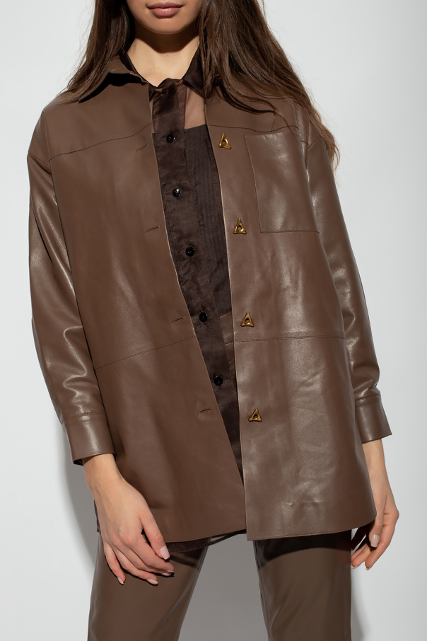 Brown ‘Hannah’ leather jacket from Aeron. Made of lamb leather, this style features decorative gold-tone buttons, a waist-cinching belt, a slip pocket on the front, bottom splits and long sleeves with button closures.