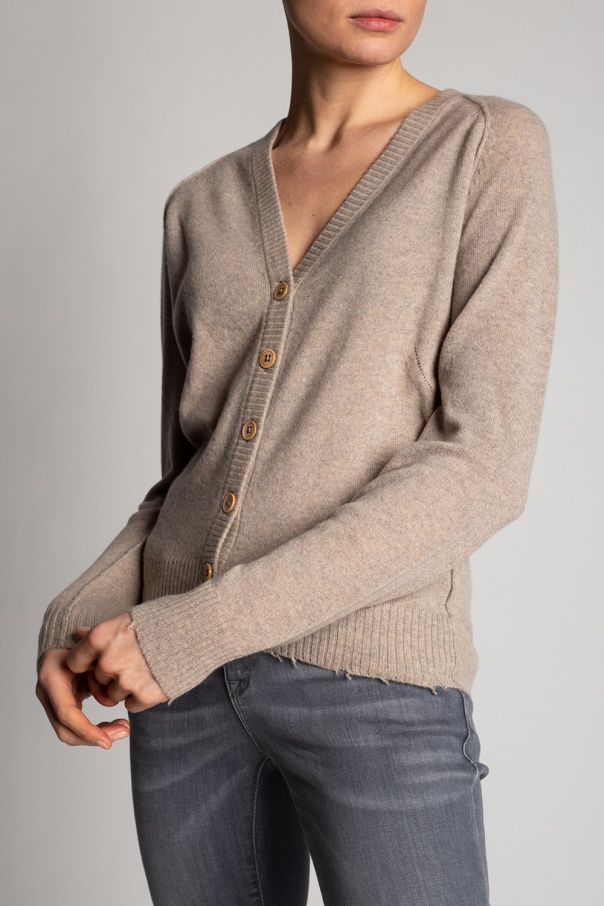 Beige V-neck cardigan from Zadig & Voltaire. Crafted from cashmere knit, this item fastens via buttons and features star-shaped elbow patches in silver-tone, and a raw-cut hem.