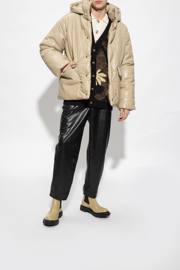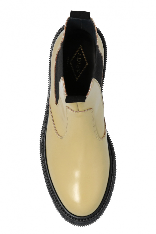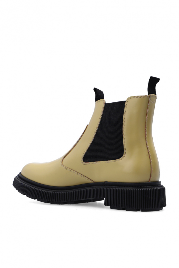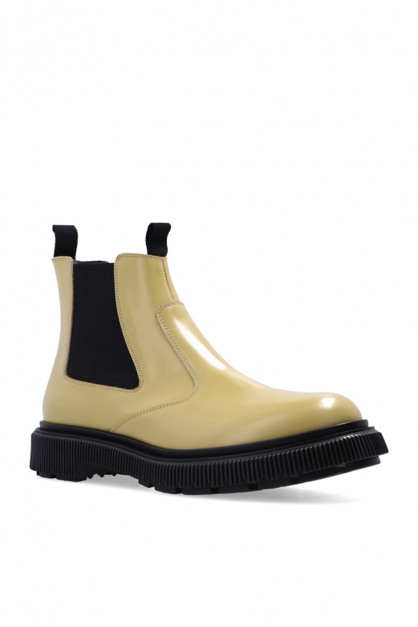 Beige and green ‘Type 156’ Chelsea boots from Adieu Paris. Made of leather, this model features elasticated panels, almond toe and black rubber sole.