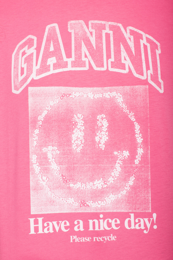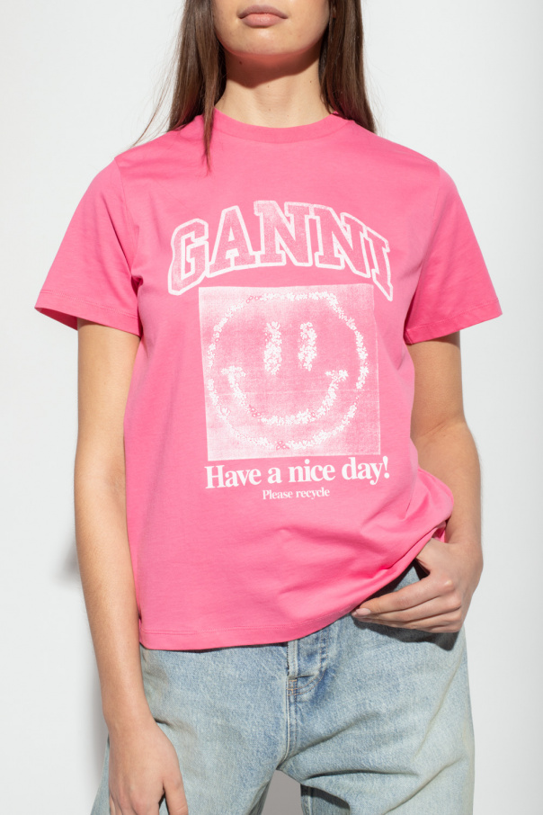 Pink crewneck T-shirt from Ganni. Crafted from organic cotton, this style features an elasticated collar and a white graphic print across the front.