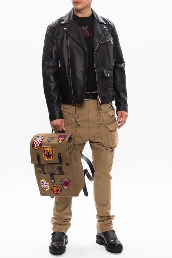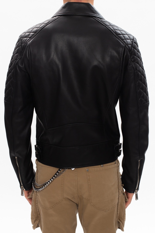 Black biker jacket from Dsquared2. Crafted from ovine leather, this style employs zip fastening, three zipped pockets and one snap-fastened flapped pocket on the front as well as long sleeves with zipped vents.