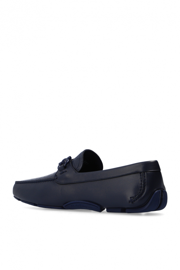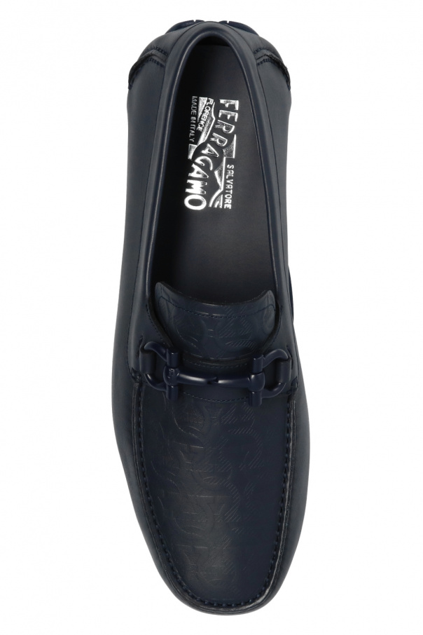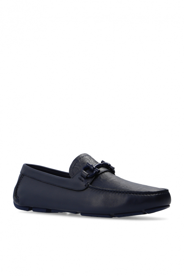 Navy blue ‘Parigi’ moccasins from Salvatore Ferragamo. Crafted from calf leather, this model sits on a navy blue rubber sole and showcases a logo pattern.