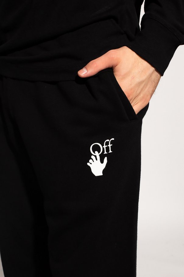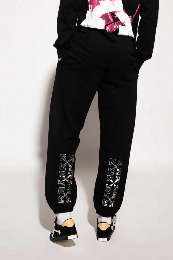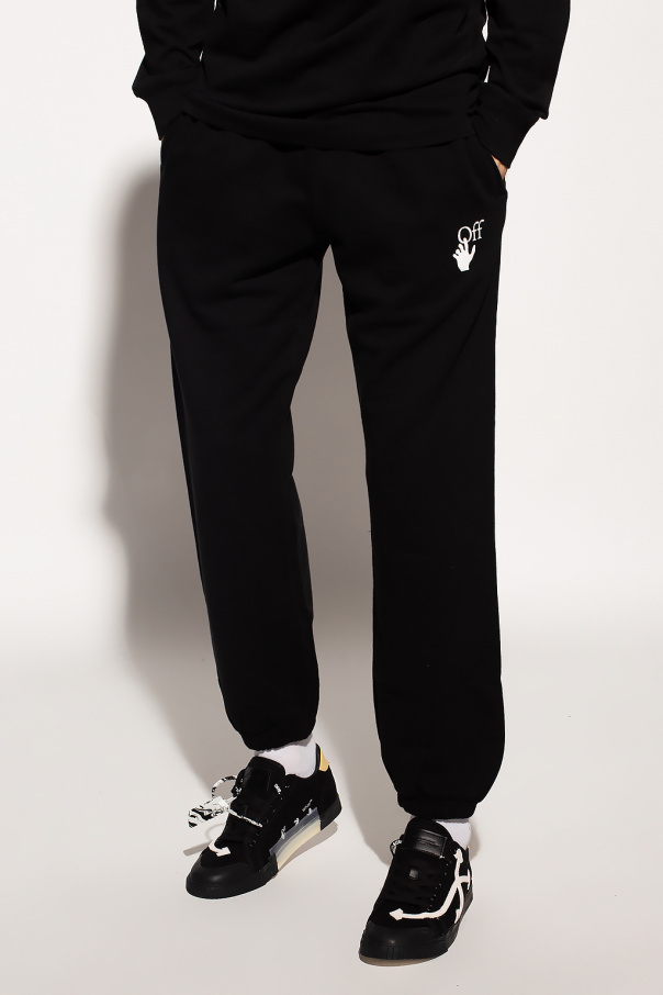 Black sweatpants from Off-White. Crafted from cotton, this pair features a drawstring waist, the label’s signature geometric print, two front pockets and ribbed cuffs.
