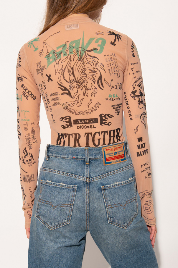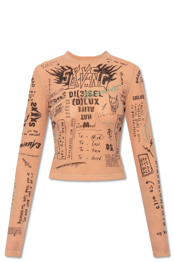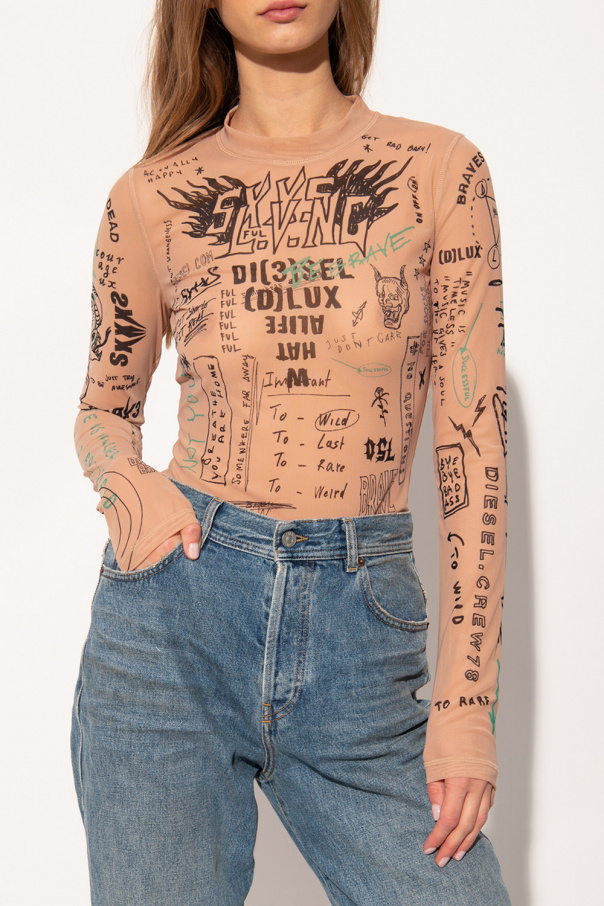 Beige top from Diesel. Crafted in sheer fabric, this style showcases a tattoo-inspired motif, a round neck and long sleeves.