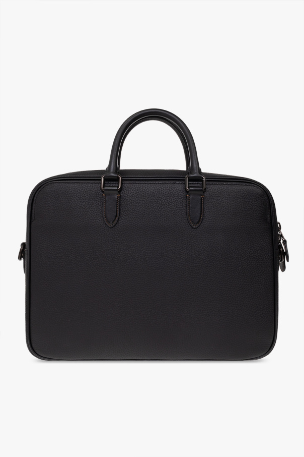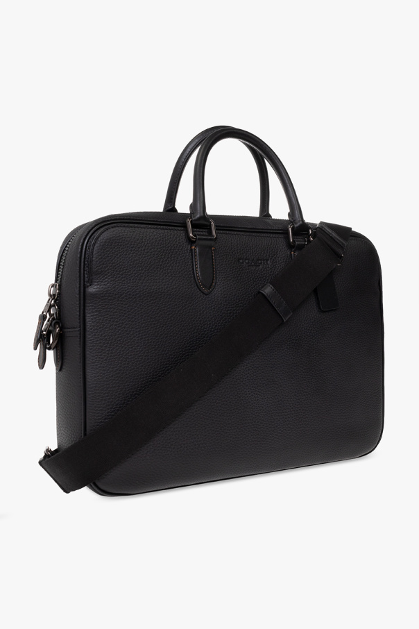 Black ‘Gotham’ briefcase from Coach. Made of grained leather, this item features a two-way zip, embossed logo, the brand’s signature keyring, pockets with magnetic closure on the front and back, two half-round handles, detachable and adjustable shoulder strap, silver-tone metal hardware and one internal compartment with two slip pockets and one zip pocket.