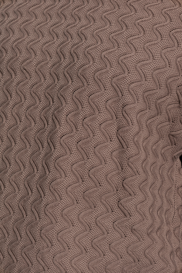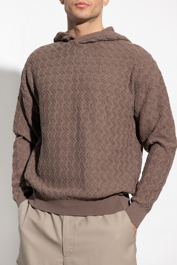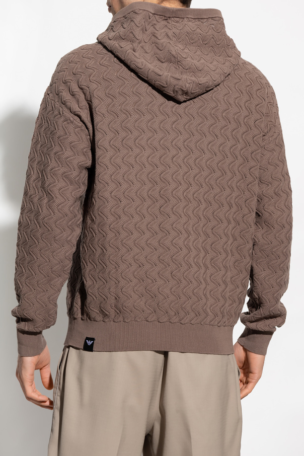 Brown hooded sweater from Emporio Armani. Crafted from cotton with a decorative knit, this design features a logo patch at the back and ribbed trims at the hem and cuffs.