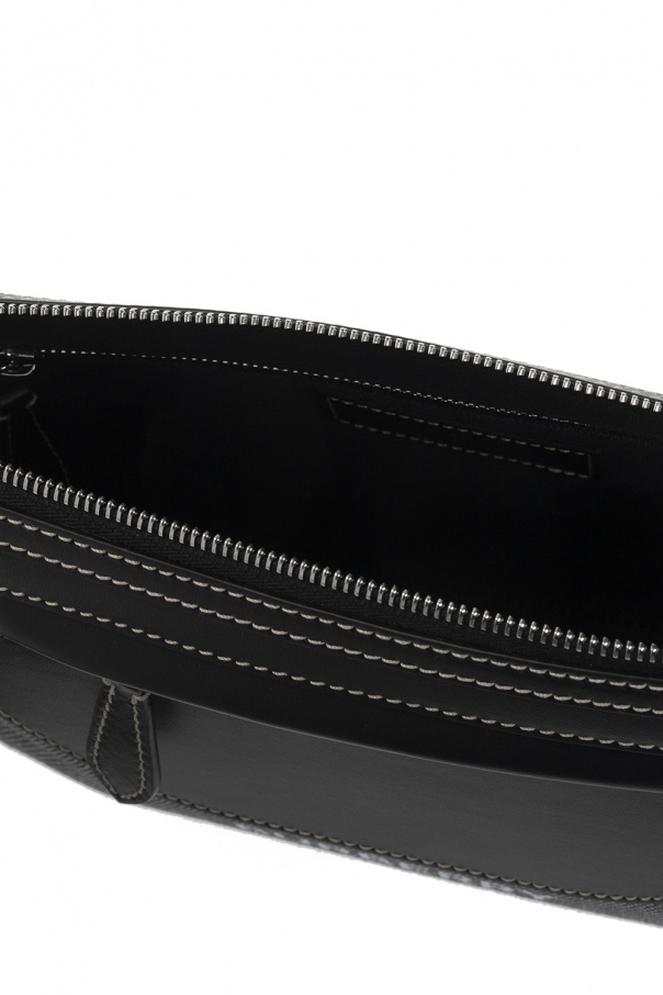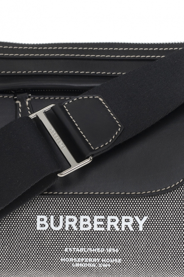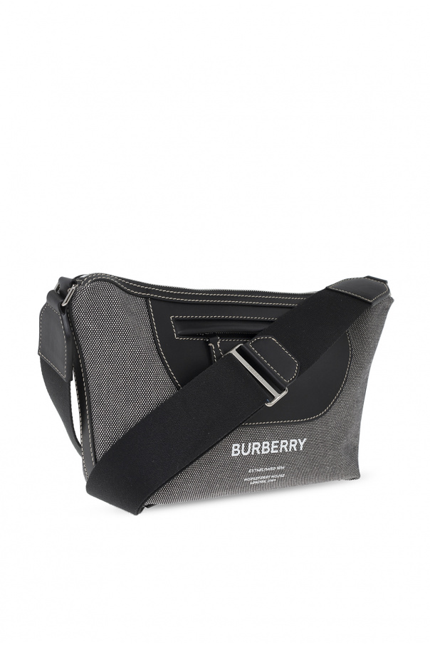 Black and grey ‘Hornsey Small’ shoulder bag from Burberry. Made of canvas trimmed with leather, this model fastens with a zip and is decorated with the ‘Horseferry’ logo in white. It is complete with a zip pocket, adjustable strap, silver-tone metal hardware and one internal compartment with one zip pocket.