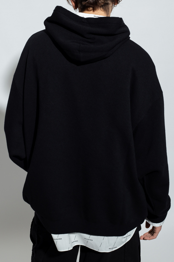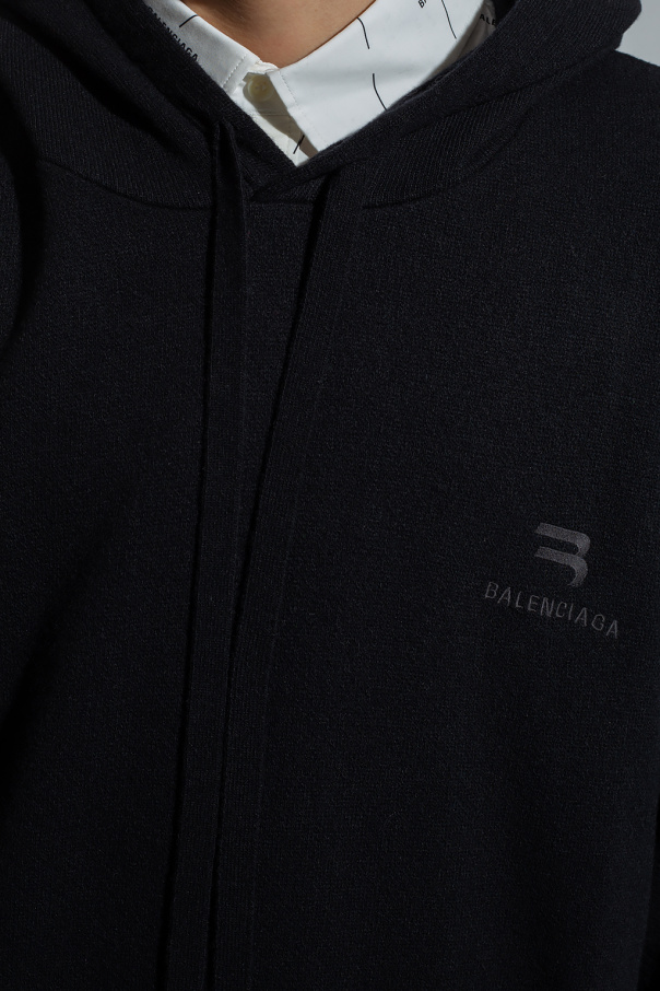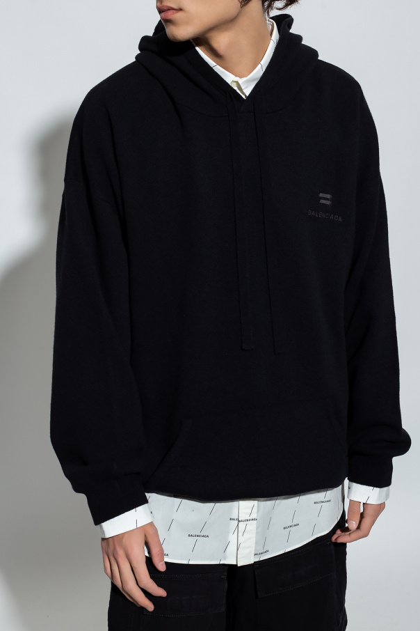 Black sweater from Balenciaga. Crafted from a cashmere and wool blend with an oversize silhouette, this style features a drawcord-adjustable hood, an embroidered logo and a kangaroo pocket on the front and ribbed trims on the bottom hem and cuffs.