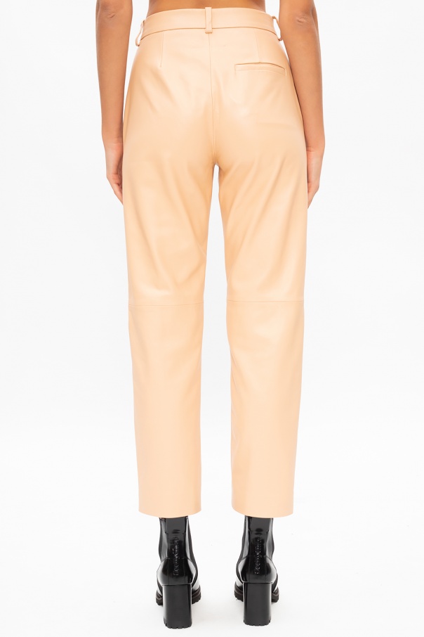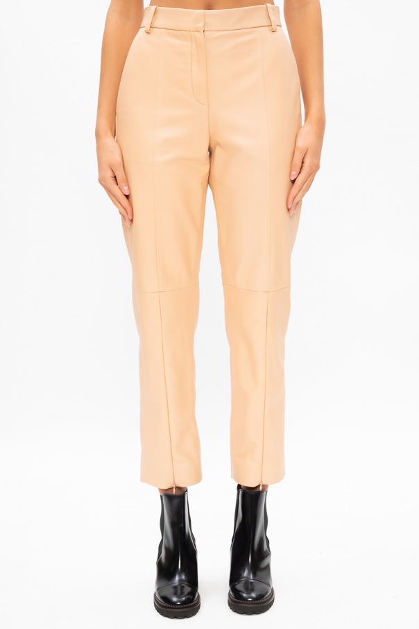 Beige trousers from MM6 Maison Margiela. Crafted from leather, this pair has a tapered leg design with stitching details along the legs, zipped vents, zip fly with hook and button fastenings and two front pockets.
