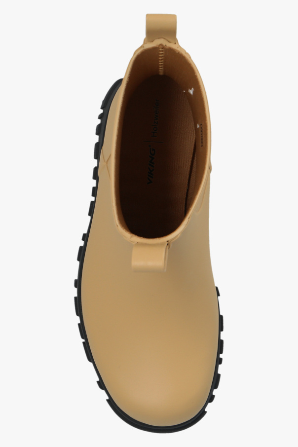 Beige ‘Andy’ rain boots from Holzweiler x Viking. Crafted from 100% waterproof and vegan natural rubber, this pair features two straps, a logo detail at the back and chunky sole.