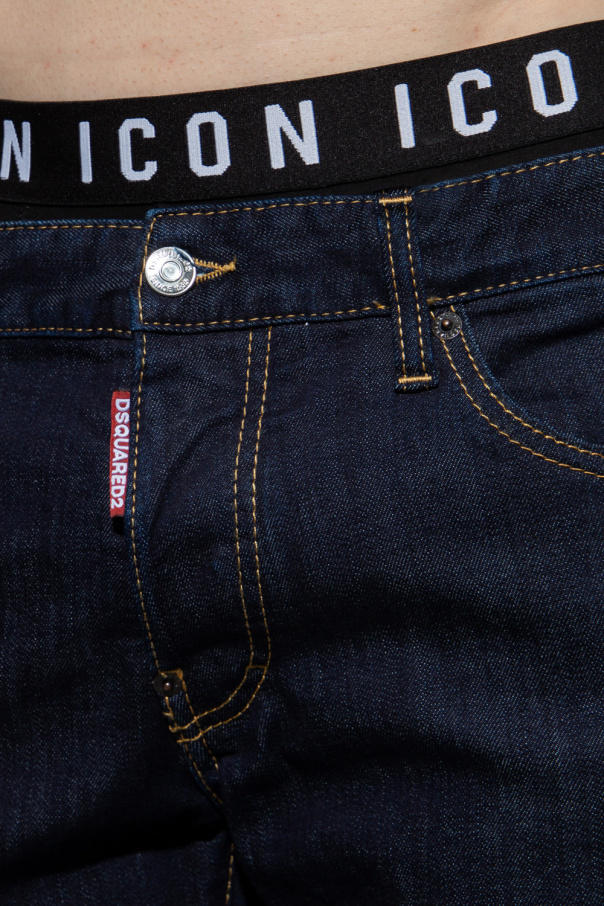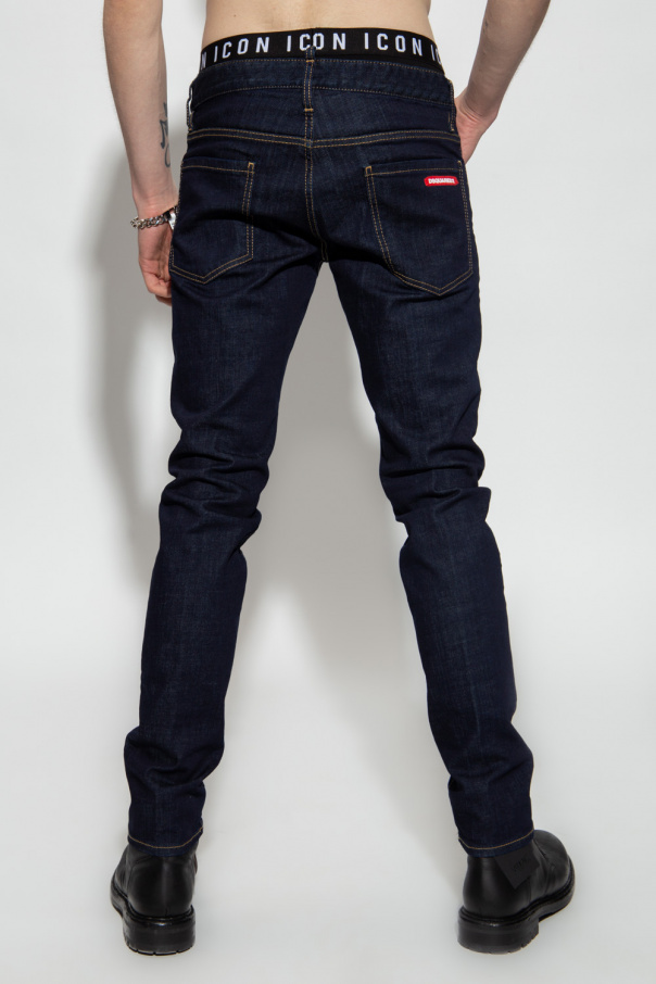 Navy ‘Slim’ jeans from Dsquared2. Inlaid with brown lurex threads, this pair is complete with buttons, a red logo patch on the front, print at the back and five slip pockets.