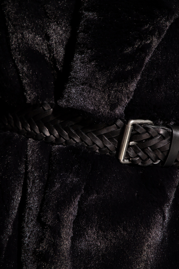 Black coat from Saint Laurent. Crafted from faux fur with cow and lamb leather trims, this garment is complete with a drawstring waist, woven belt with a silver-tone buckle, two side pockets and long sleeves.