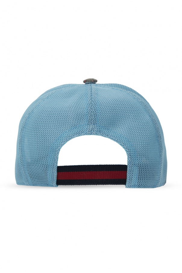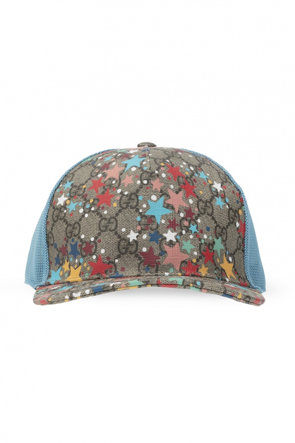 Beige and brown baseball cap from Gucci Kids. Crafted in GG Supreme canvas, this piece of headwear showcases a colourful graphic print and a blue mesh back.