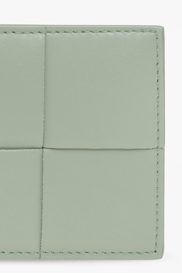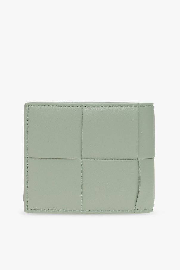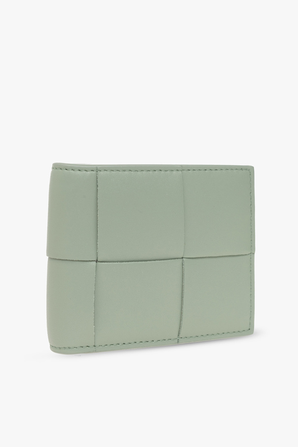 Light green bifold wallet from Bottega Veneta. Made of calf leather with the iconic Intrecciato weave, this item features one bill compartment, two slip pockets and six card slots inside.
