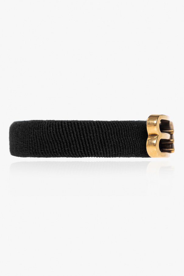 Black hair tie with a brass BB logo appliqué in antique gold-tone from Balenciaga.