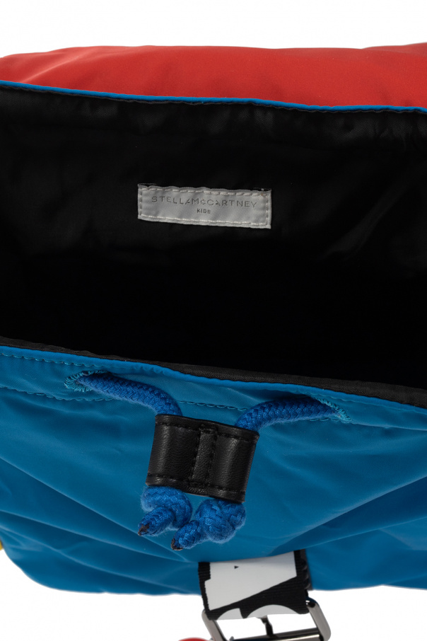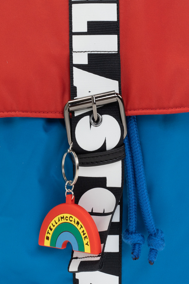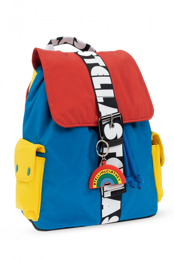 Red, blue and yellow backpack from Stella McCartney Kids. This design features fold-over top with a metal buckle, black and white stripes printed with a logo, two pockets fastens with green snaps, two adjustable shoulder straps, one internal compartment and a detachable multicolored rainbow keyring.
