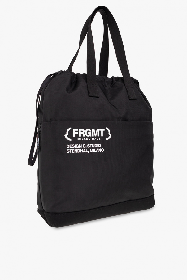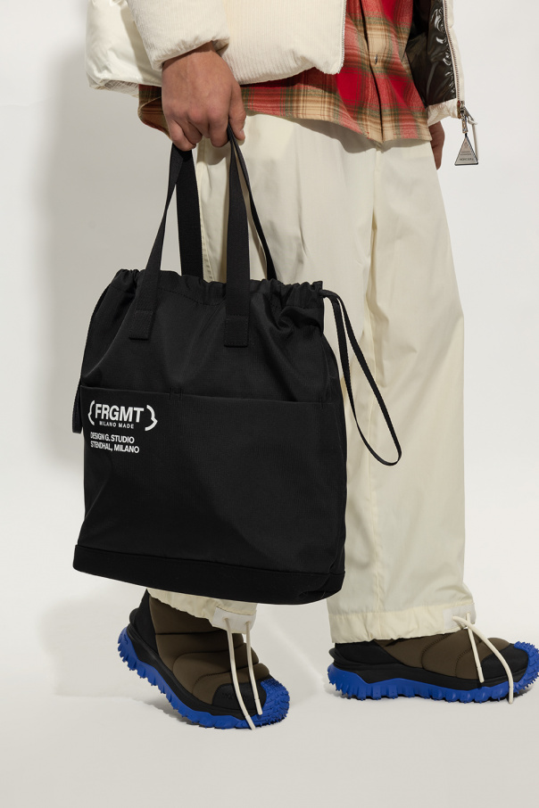 Black shopper bag from Moncler Genius, the ‘7 Moncler FRGMT Hiroshi Fujiwara’ collection. Embellished with a white logo print, this design cinches closed with drawstrings and features two slip pockets on the front, one zip pocket on the side, two handles, black metal hardware and one internal compartment with a slip pocket.