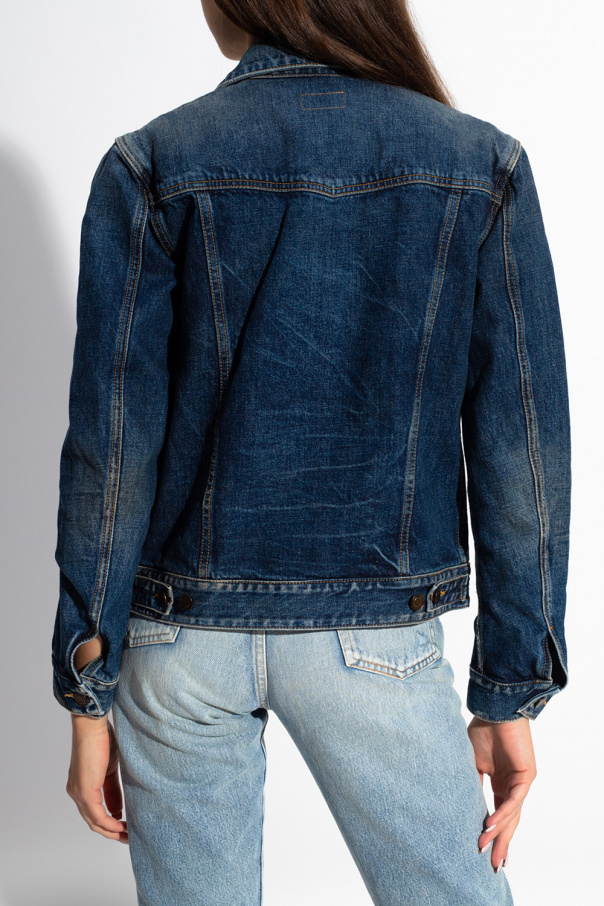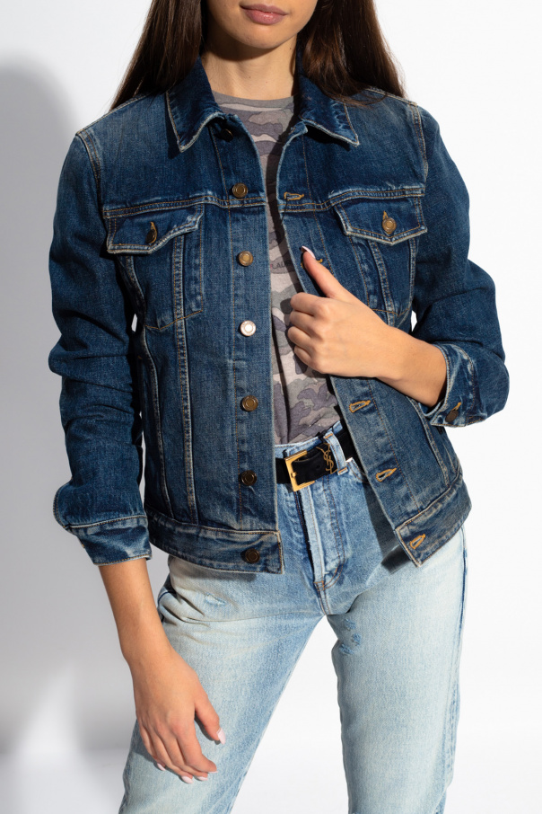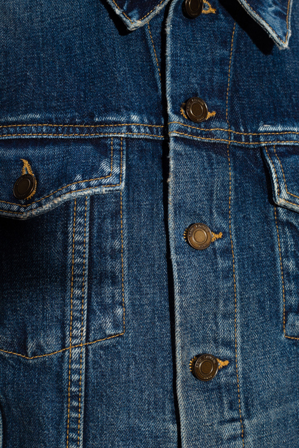 Navy distressed denim jacket from Saint Laurent. Fastened with logo-embossed buttons, this long sleeve design is complete with two slip pockets, two buttoned flap pockets and raw trims.