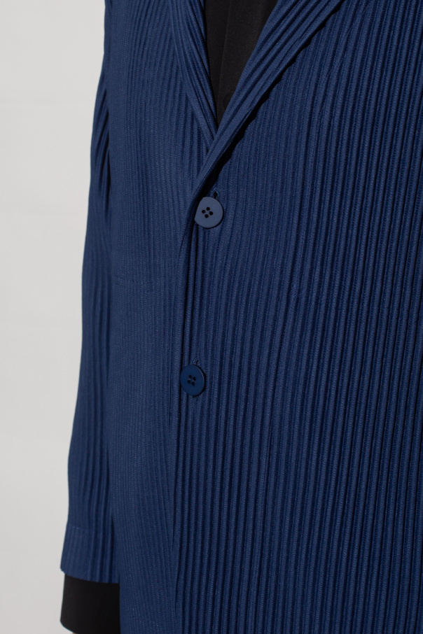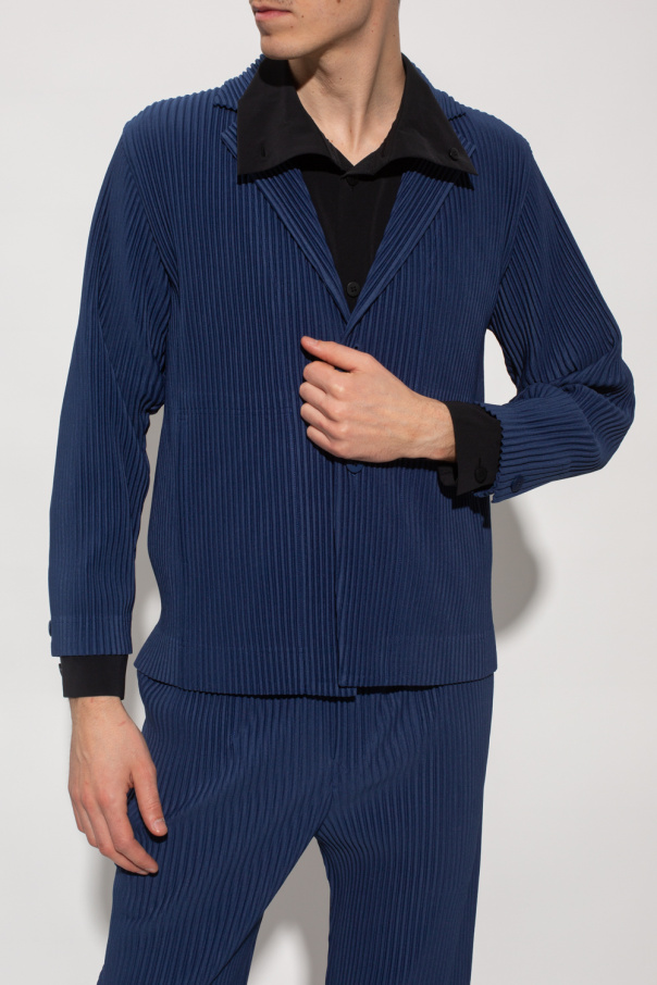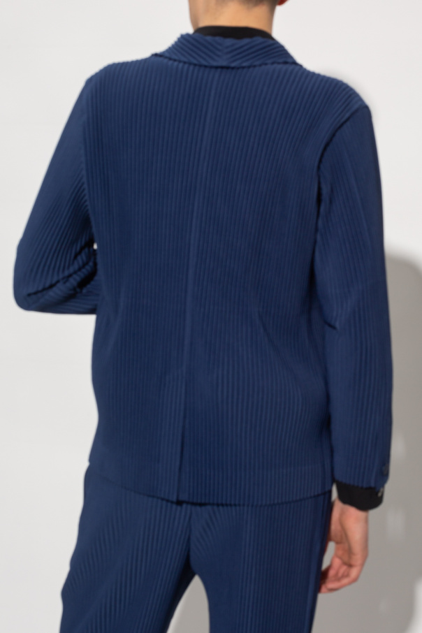 Navy pleated blazer from Issey Miyake Homme Plisse. Fastened with buttons, this long sleeve design is complete with notch lapels, two slip pockets and single rear vent.