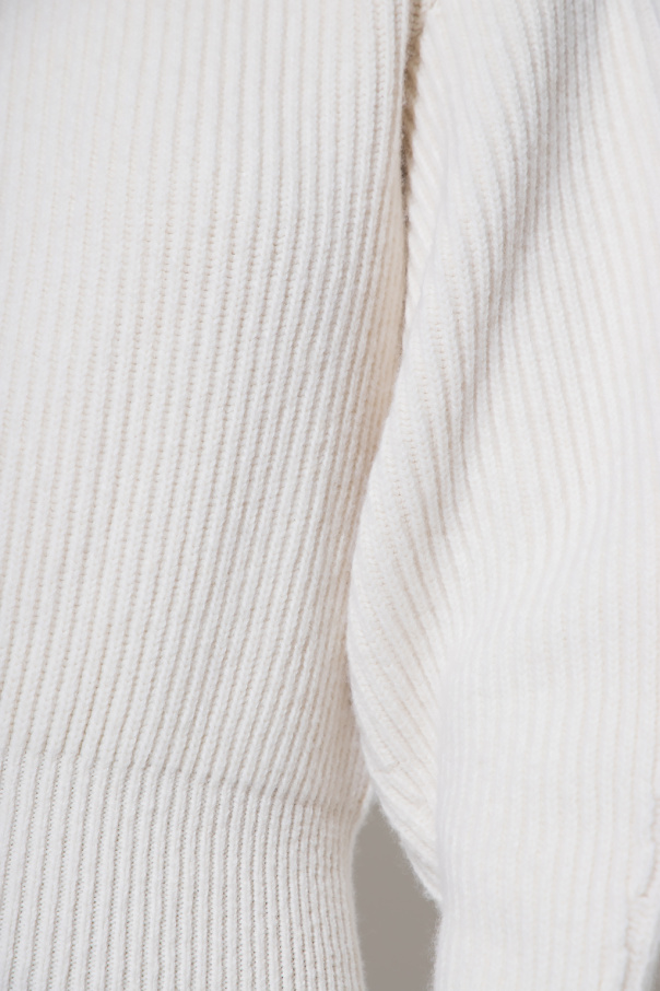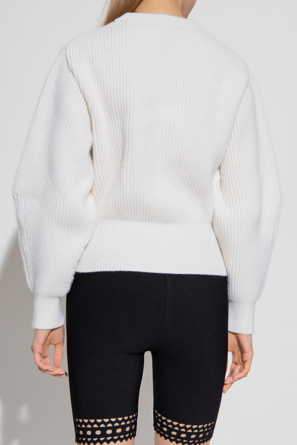 Cream ribbed sweater from Alaia. Crafted from a wool and cashmere blend, this garment features ribbed trims at the round neck, hem and cuffs.