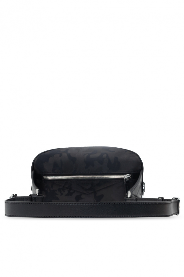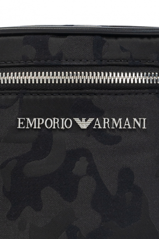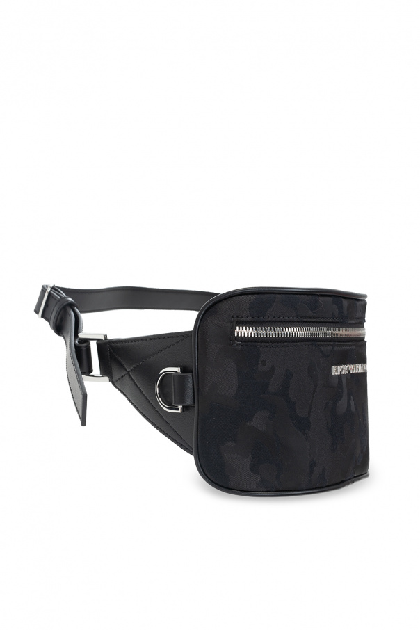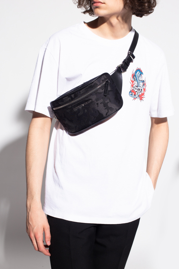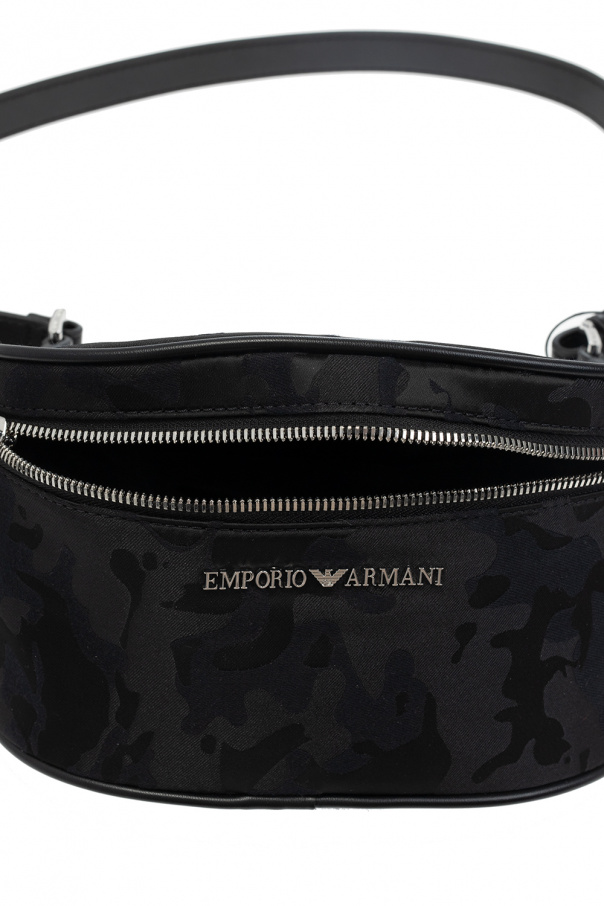 Black belt bag from Emporio Armani. Showcasing an all-over camo pattern, this item employs a zip fastening, silver-tone logo hardware, an adjustable strap with a buckle and one internal compartment.