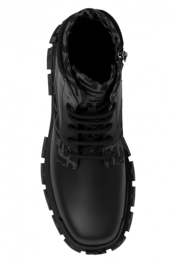 Black ‘Force’ ankle boots from Fendi. Crafted from calf leather, this lace-up model sits on a black rubber sole and features a side zip closure, fabric inserts with a jacquard logo motif, and included swappable shoelaces.