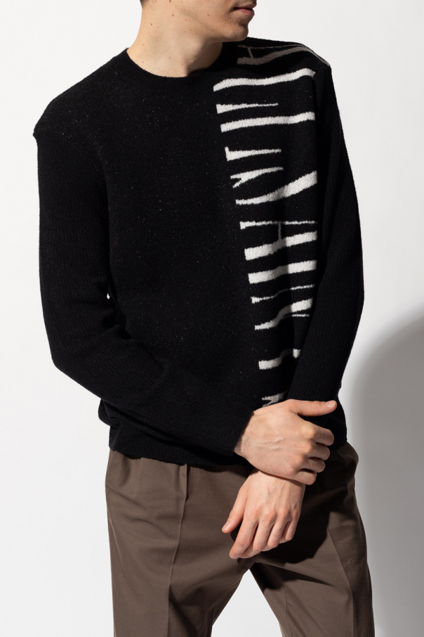 Black ‘Vex’ crewneck sweater from AllSaints. Knitted from a wool blend with the brand's lettering in white, this jumper is complete with ribbed trims.
