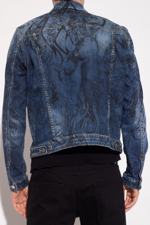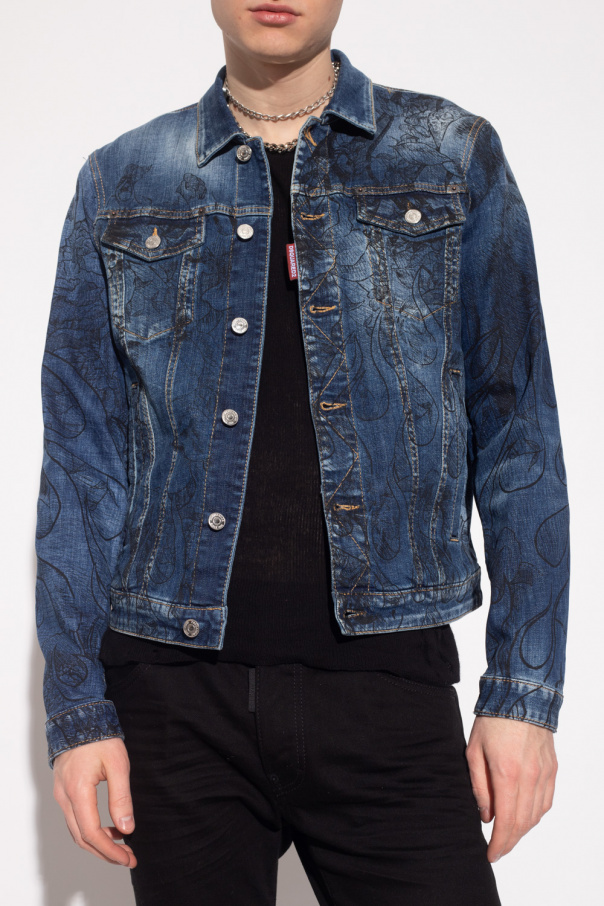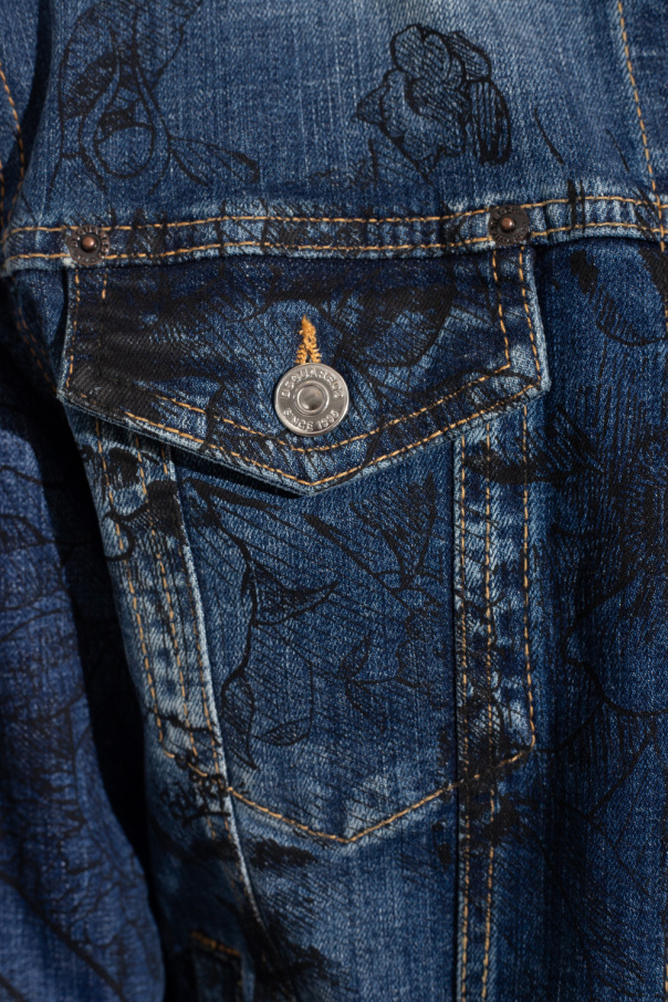 Navy blue ‘Dan’ denim jacket from Dsquared2. Embellished with a black floral print, this style features silver-tone button closures, a red and white logo tag on the front, two welt pockets, two button flapped pockets and long sleeves.