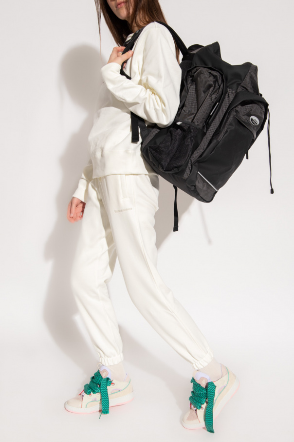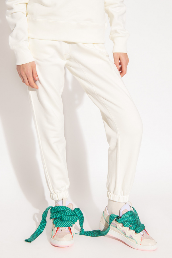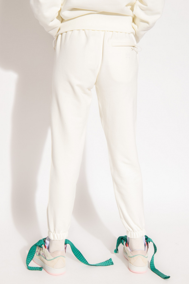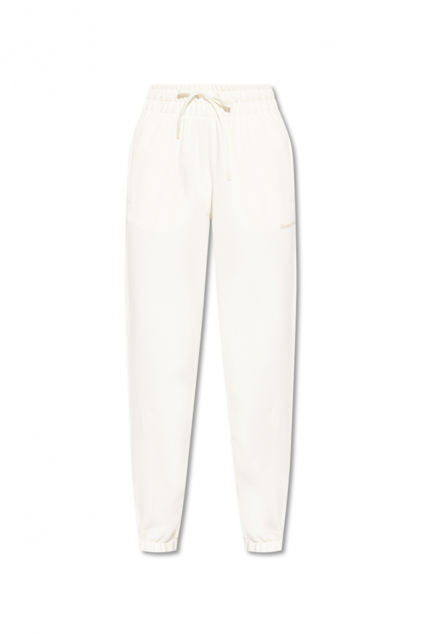Cream sweatpants from ADIDAS Originals x Human Race. Crafted from organic cotton with the BCI certificate, this pair features an elastic waistband with drawstrings, grey logo print, embroidered Trefoil logo, two front pockets, one back pocket and ribbed cuffs.