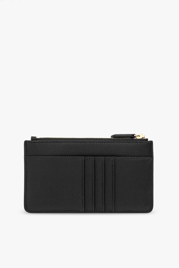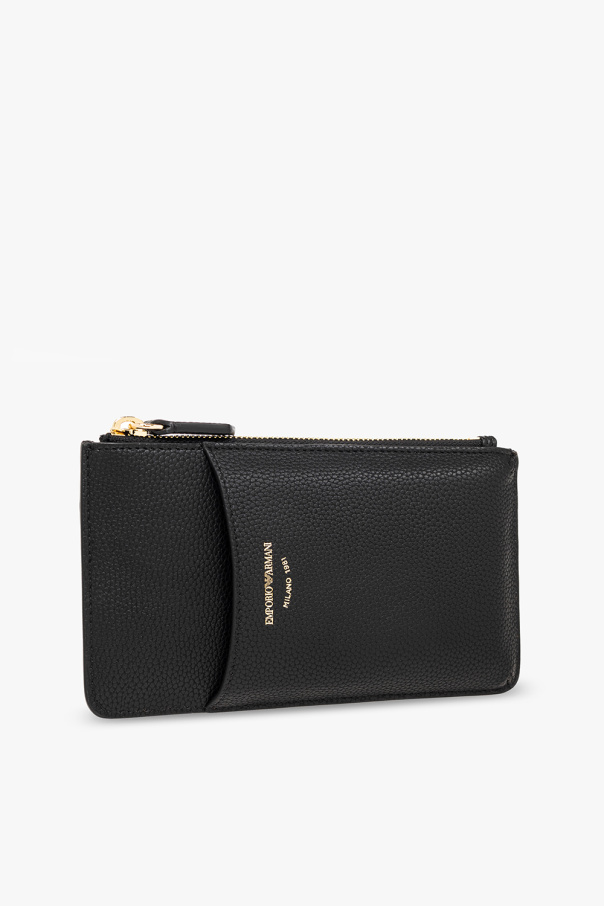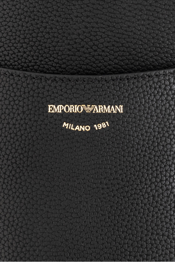Black phone holder from Emporio Armani. Made of faux leather, this design features a mobile phone compartment accompanied by a logo print on the front, one zip pocket, four card slots and one slip pocket at the back, and gold-tone metal hardware.