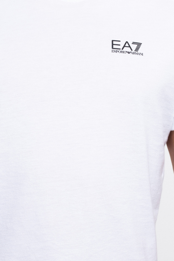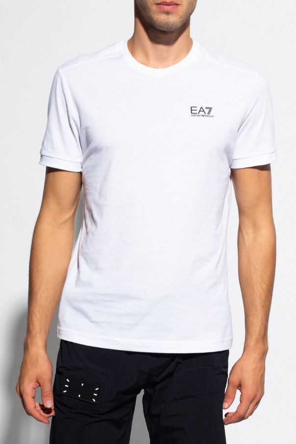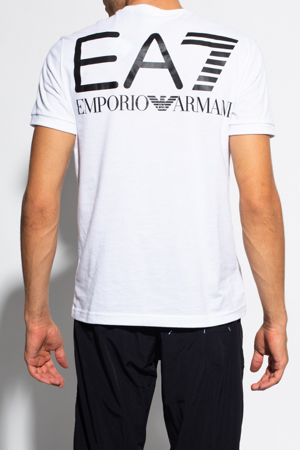 White T-shirt from EA7 Emporio Armani. This round neck design features a printed logo pattern in black as well as short sleeves with ribbed cuffs.