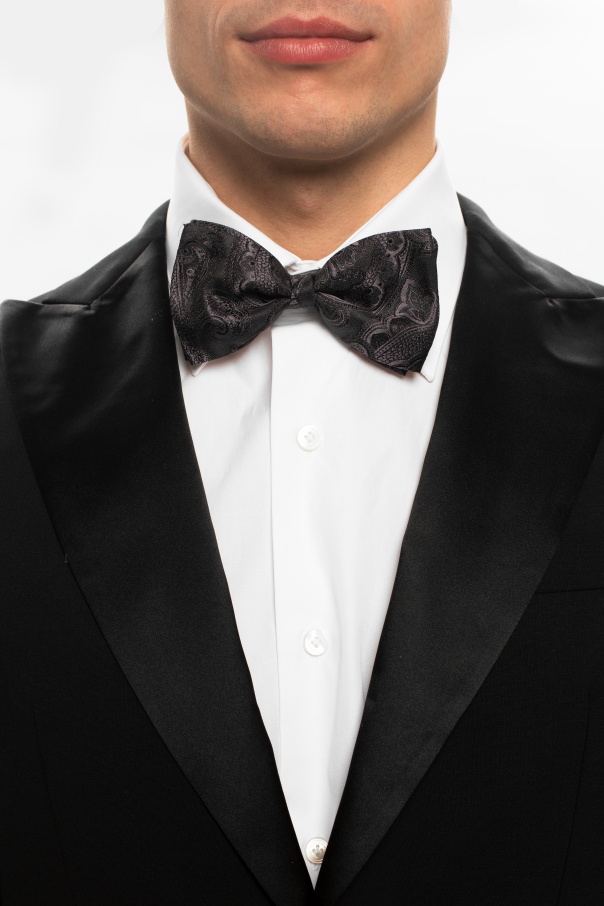 Black and grey bow tie from Etro. Made of silk, this item showcases an embroidered pattern, gold-tone metal hardware and snap adjusters.