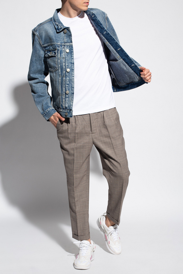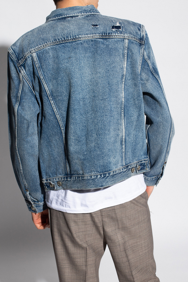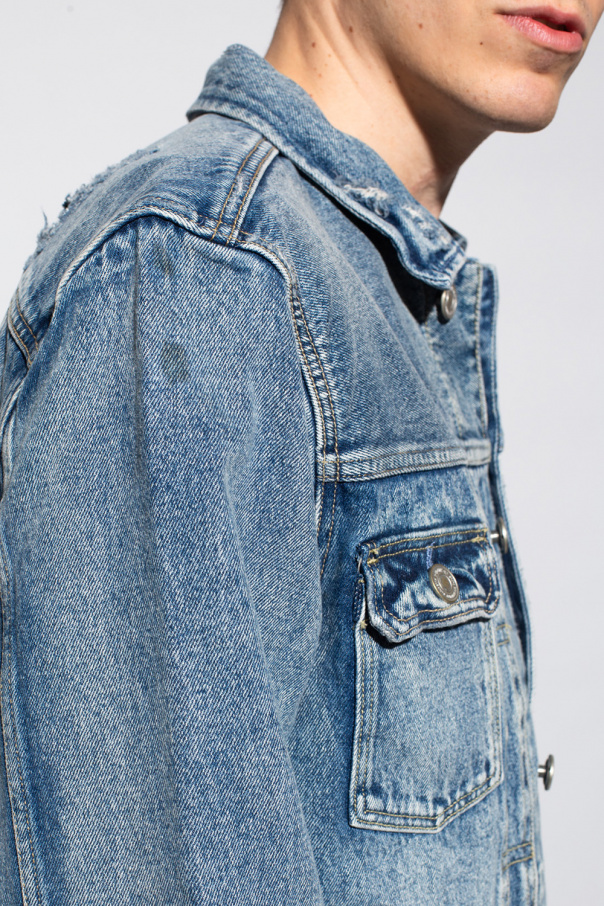 Blue ‘Delta’ stonewashed denim jacket from AllSaints. Fastened with buttons, this garment is complete with two slip pockets, two buttoned flap pockets and raw cut edges.