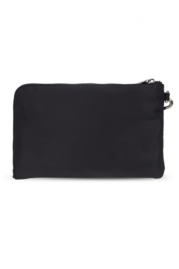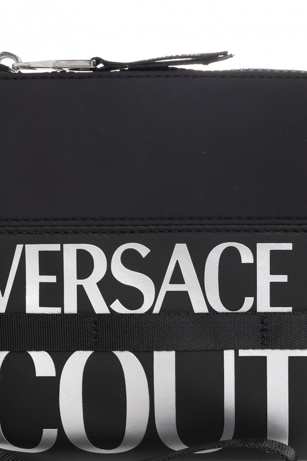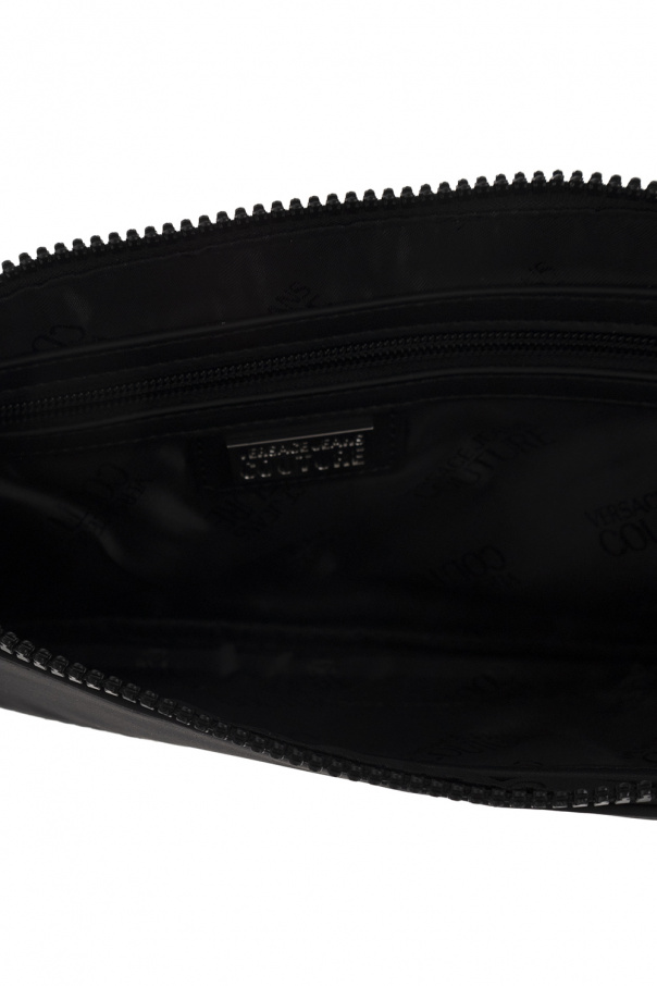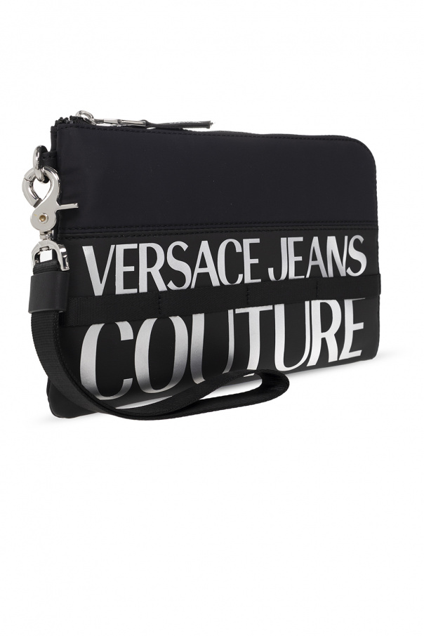 Black handbag from Versace Jeans Couture. Printed at front with a white logo, this design features a zip fastening, a detachable wrist strap on the side, silver-tone metal hardware and one internal compartment with one zip pocket and one slip pocket.